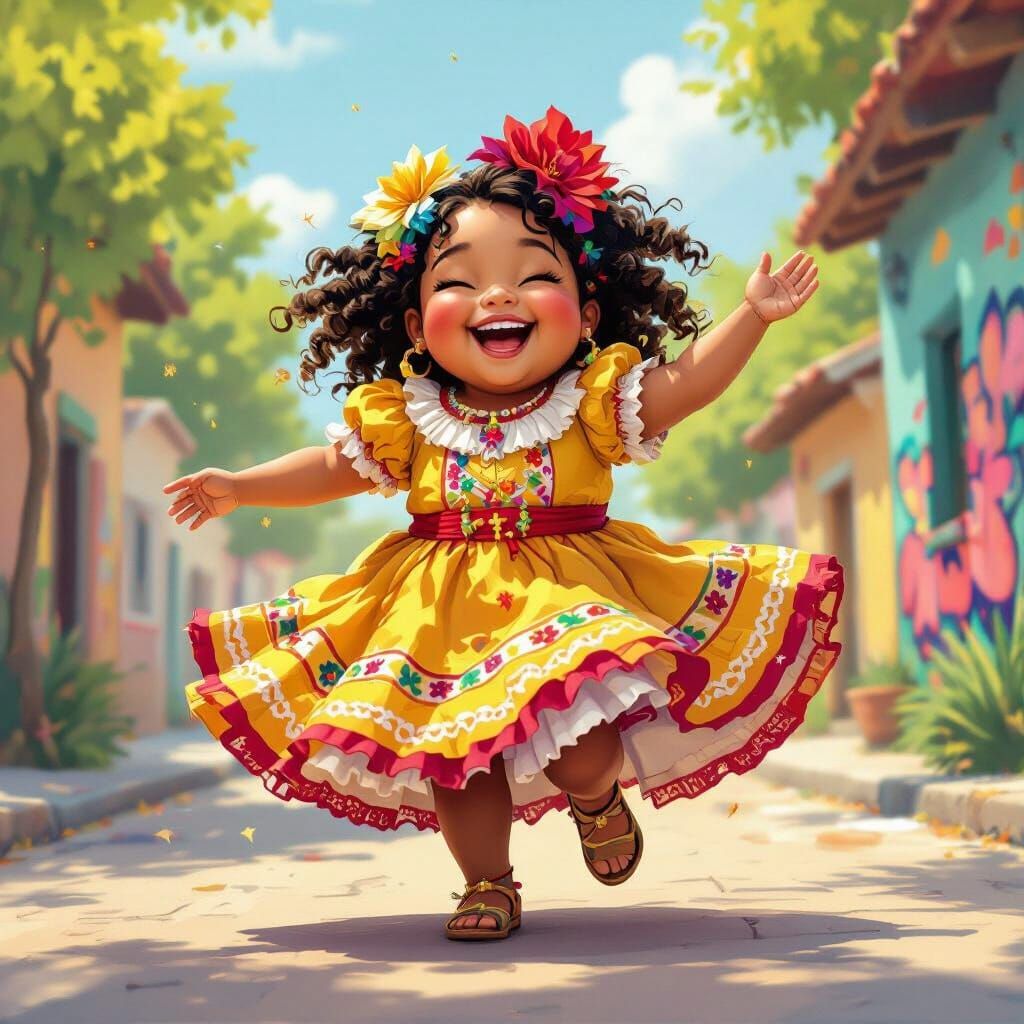A beaming Black girl in colorful Hispanic clothing celebrates culture and unity. The image features vibrant colors and a joyful atmosphere, created with spray paint and oil gouache techniques.