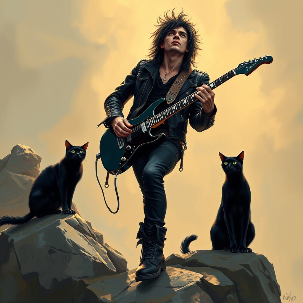 A captivating rockstar, surrounded by the mystery of the wilderness, loses himself in the rhythm of his music, as a sleek black cat watches with piercing green eyes. Moody, golden lighting and bold colors evoke the raw energy of rock music and the allure of the unknown.