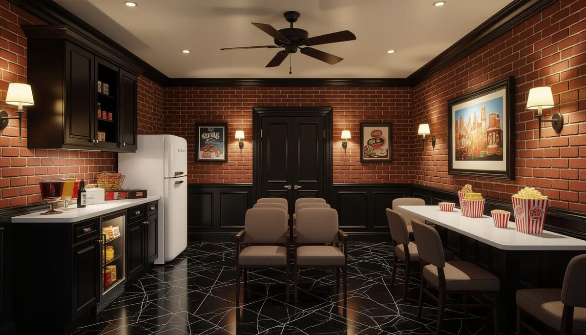 This image depicts a detailed Victorian movie room featuring brick wallpaper, marble floors, and vintage appliances. It includes a hidden door and theater seating, rendered with dramatic lighting and a moody cinematic style.