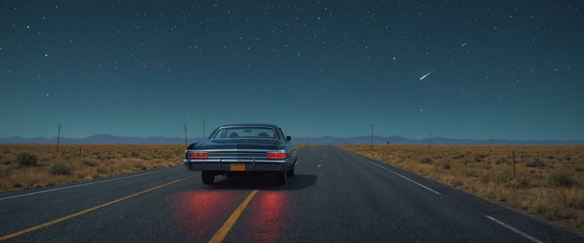 This image depicts a hyperrealistic, ominous scene of an empty black space with a 1967 Chevy Impala speeding towards the horizon. Stars are scattered throughout, with sharp contrast and deep colors.
