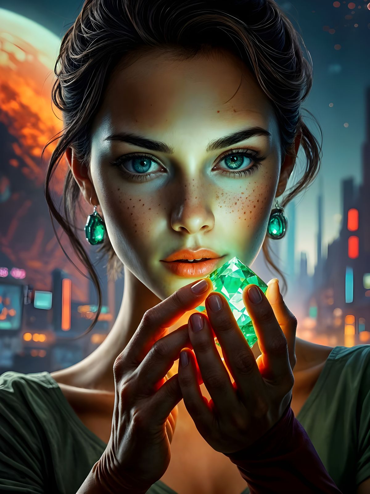 This image features a hyperrealistic anime woman with freckled hair, holding an emerald that radiates a bright light, illuminating her face in a dramatic and intricately detailed scene, showcasing vibrant colors and dynamic lighting.