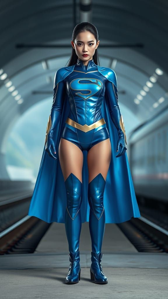 A hyper-realistic panorama of Supergirl Blue Star, a Chinese superheroine, in a water-blue patent leather suit. The scene is set at a modern high-speed railway tunnel exit, captured in cinematic 8K HDR.