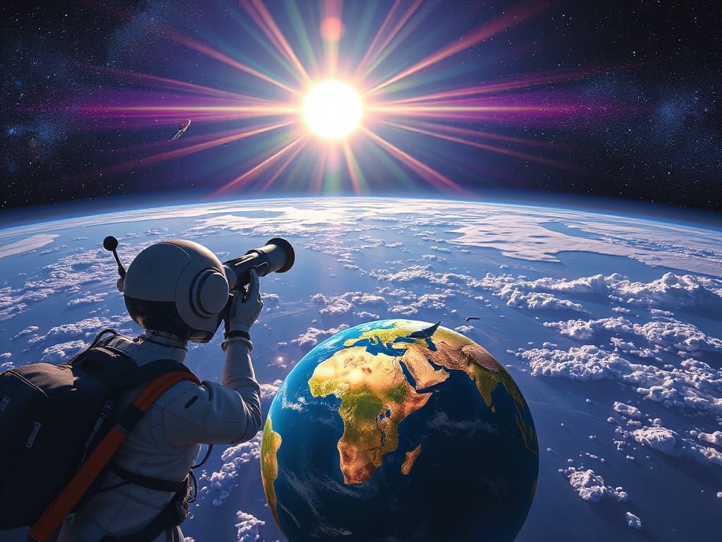 This image shows a bio-robot space observer gazing through a crystal telescope at a crystalline flower sun rising above a space ocean. Earth sleeps below in a pearlescent atmosphere in hyperdetailed space realism.