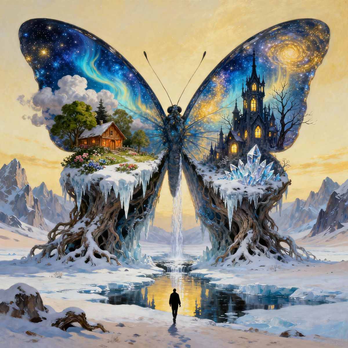 This image depicts a colossal, surreal butterfly in a frozen valley. Its wings act as portals to miniature fantasy worlds, rendered in an ultra-detailed painterly oil style with cosmic colors.