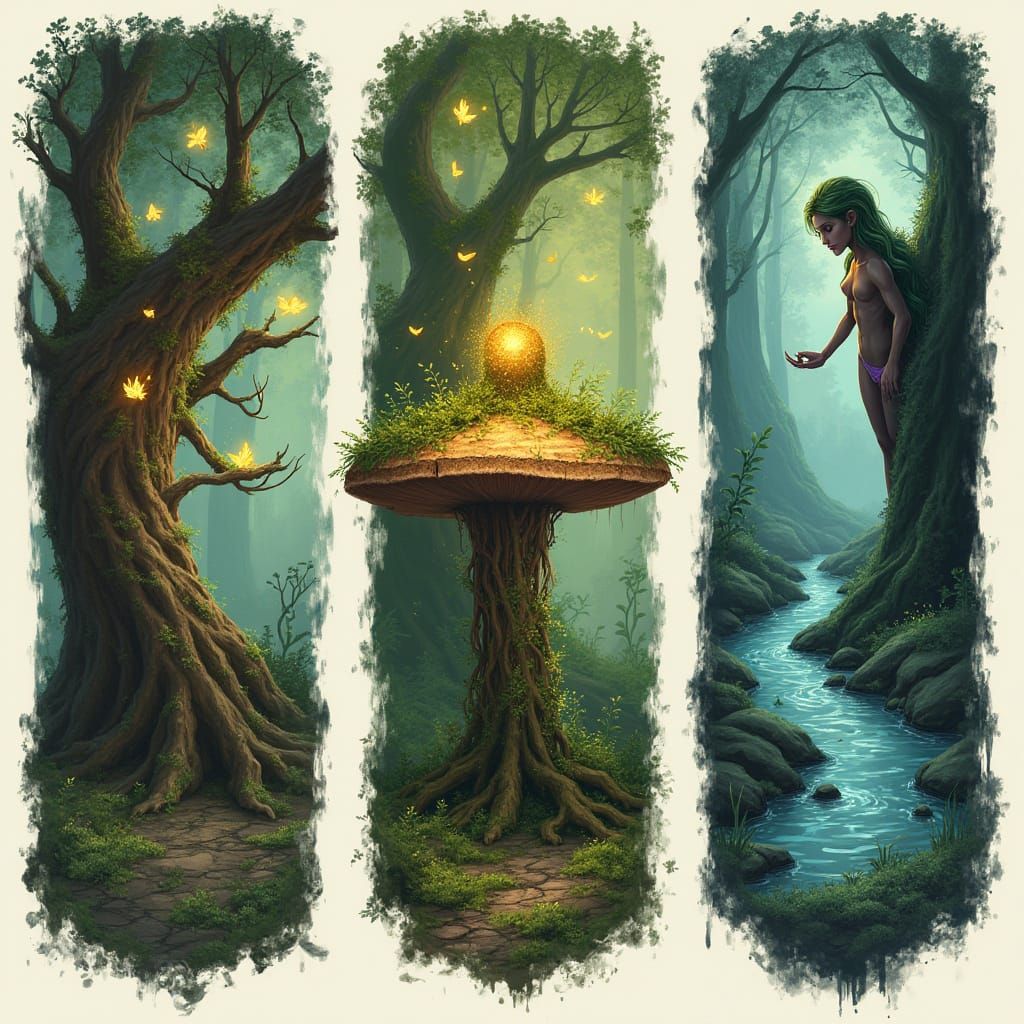 This image showcases NFT digital art of forest spirits: an Oak Guardian, Mushroom Whisperer, and Stream Nymph. Created in a high fantasy concept art style with organic textures and a magical color palette.