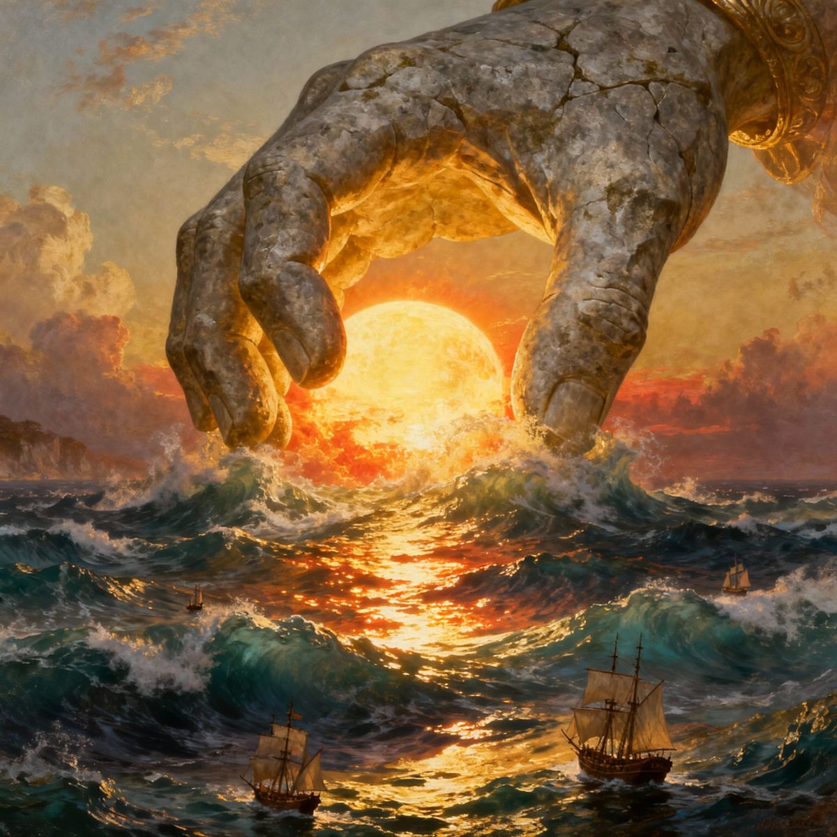 This image shows a giant stone hand rising from the sea to seize the sun. Tiny ships sail below, bathed in the sun's reflection on the waves, rendered in a dramatic fantasy concept art style.