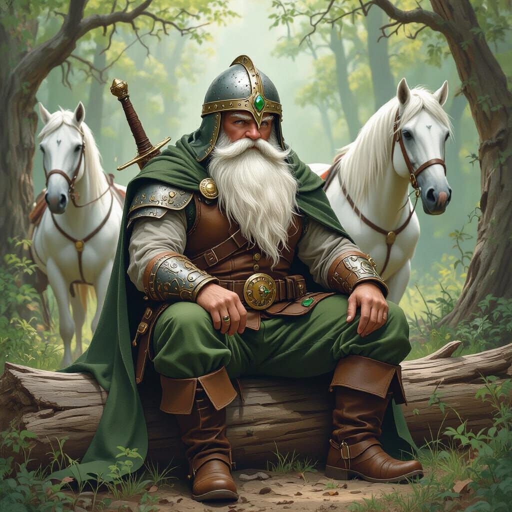 A fantasy illustration of a dwarf seated on a log in an enchanted forest. He is clad in earthy tones with a studded helmet and strapped sword, rendered with intricate details.