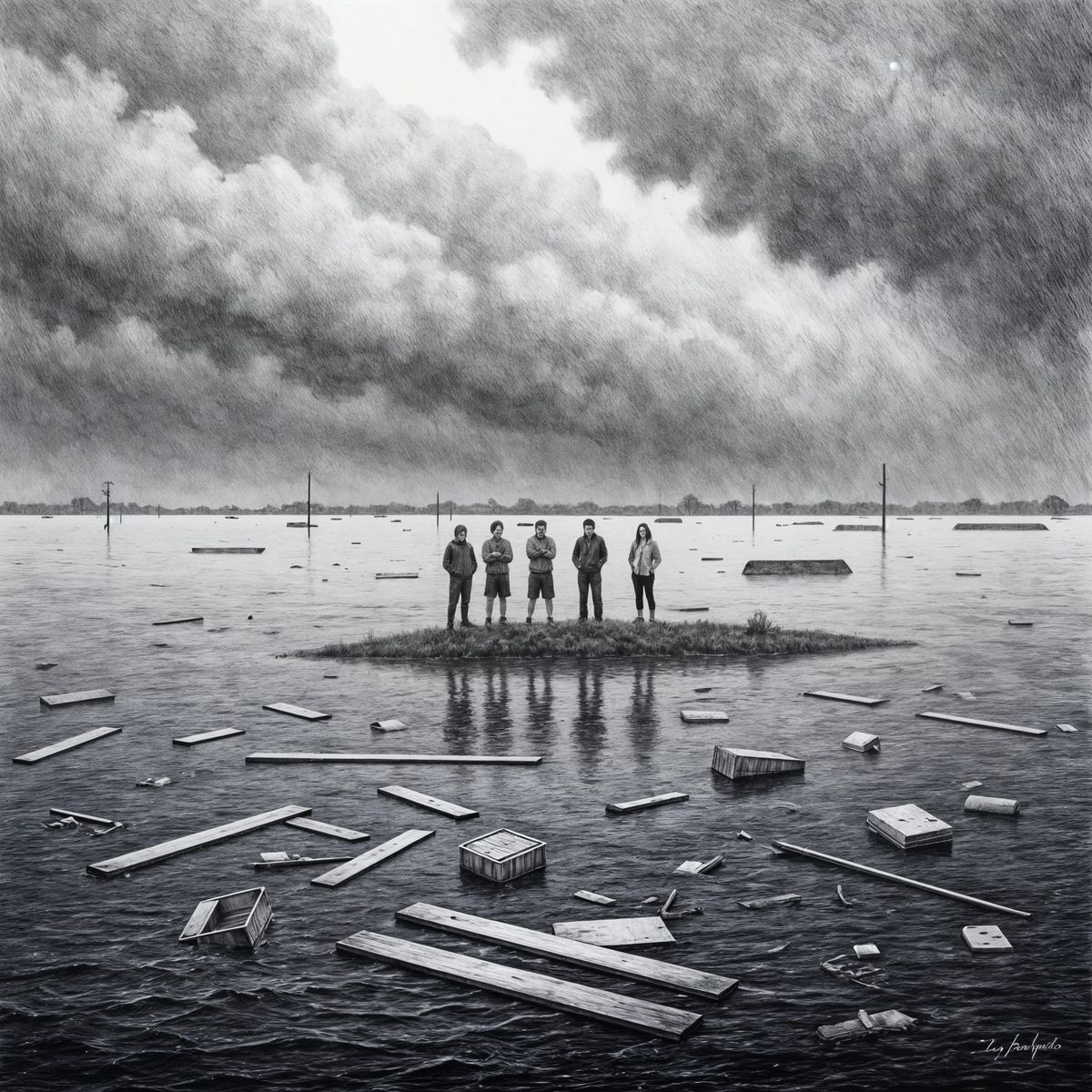 This image shows a dramatic monochromatic graphite drawing of a massive flood in a flat landscape. Tiny figures watch the roiling dark water from a levee, rendered with obsessive pencil work and atmospheric detail.
