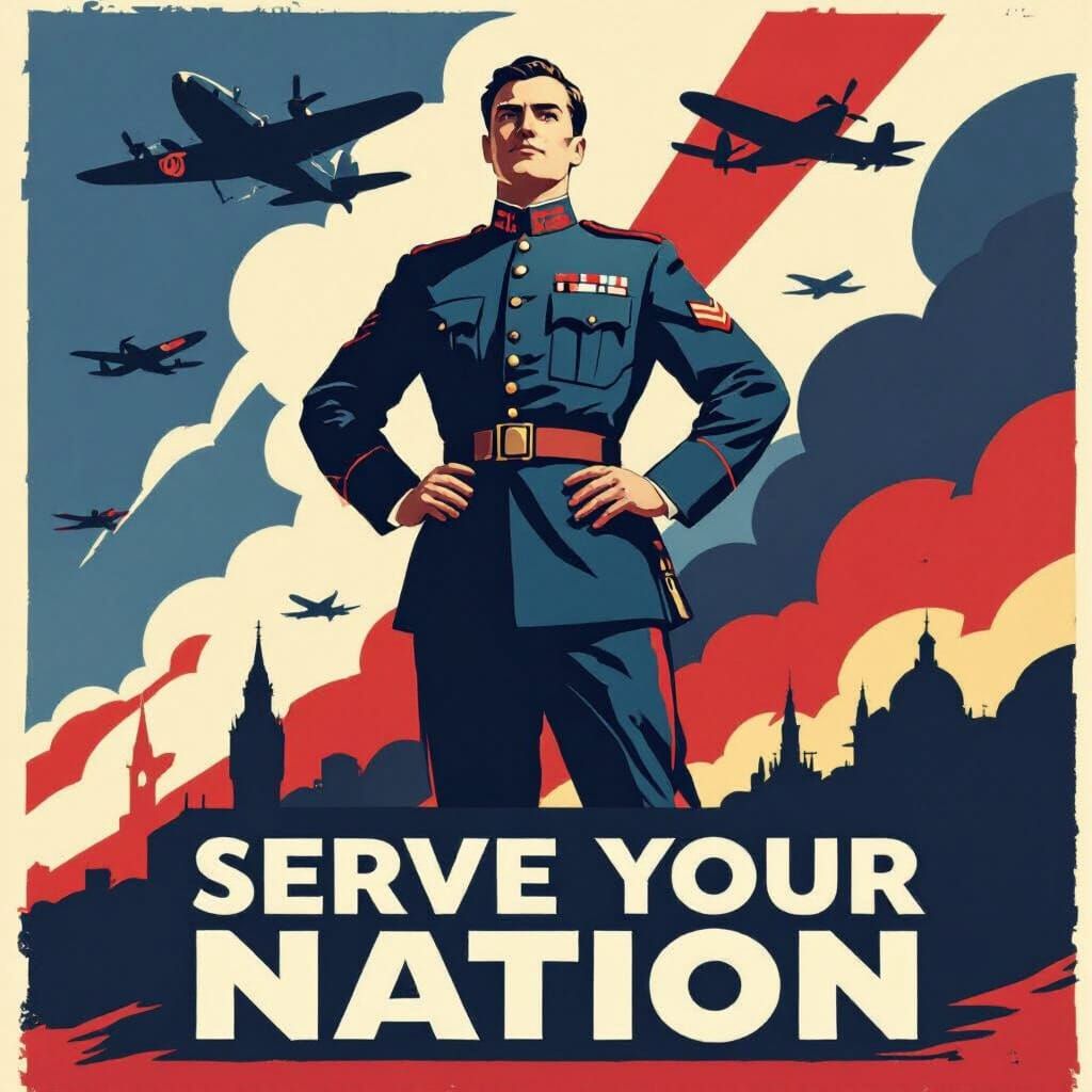 This image features a bold, art deco style British WW1 recruitment poster. A proud soldier stands beneath bombers, with 'Serve Your Nation' text. Uses dramatic lighting and a red, white, and blue palette.
