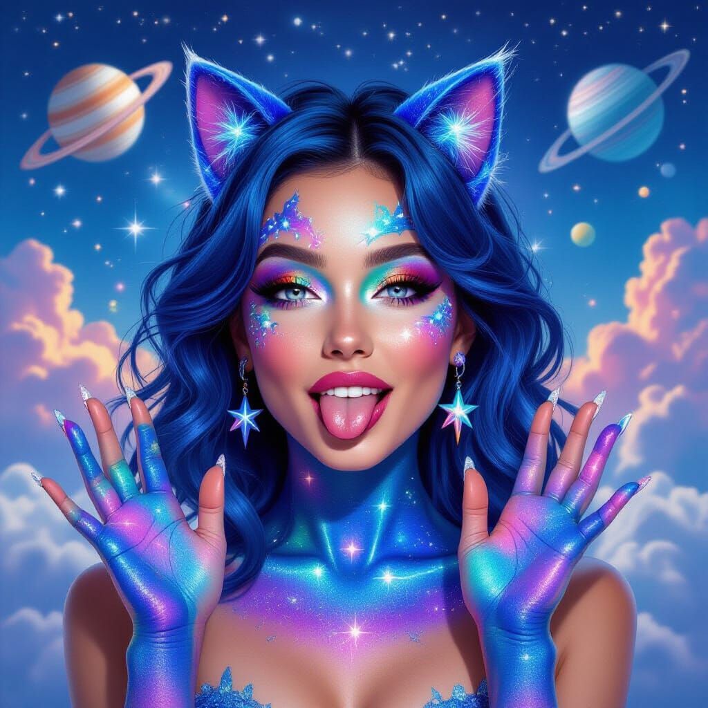 A striking portrait of a woman with vibrant, galaxy-themed body paint on her face, hands, and torso. Features blue hair, cosmic eye makeup, and celestial background art in a detailed, ethereal digital style.