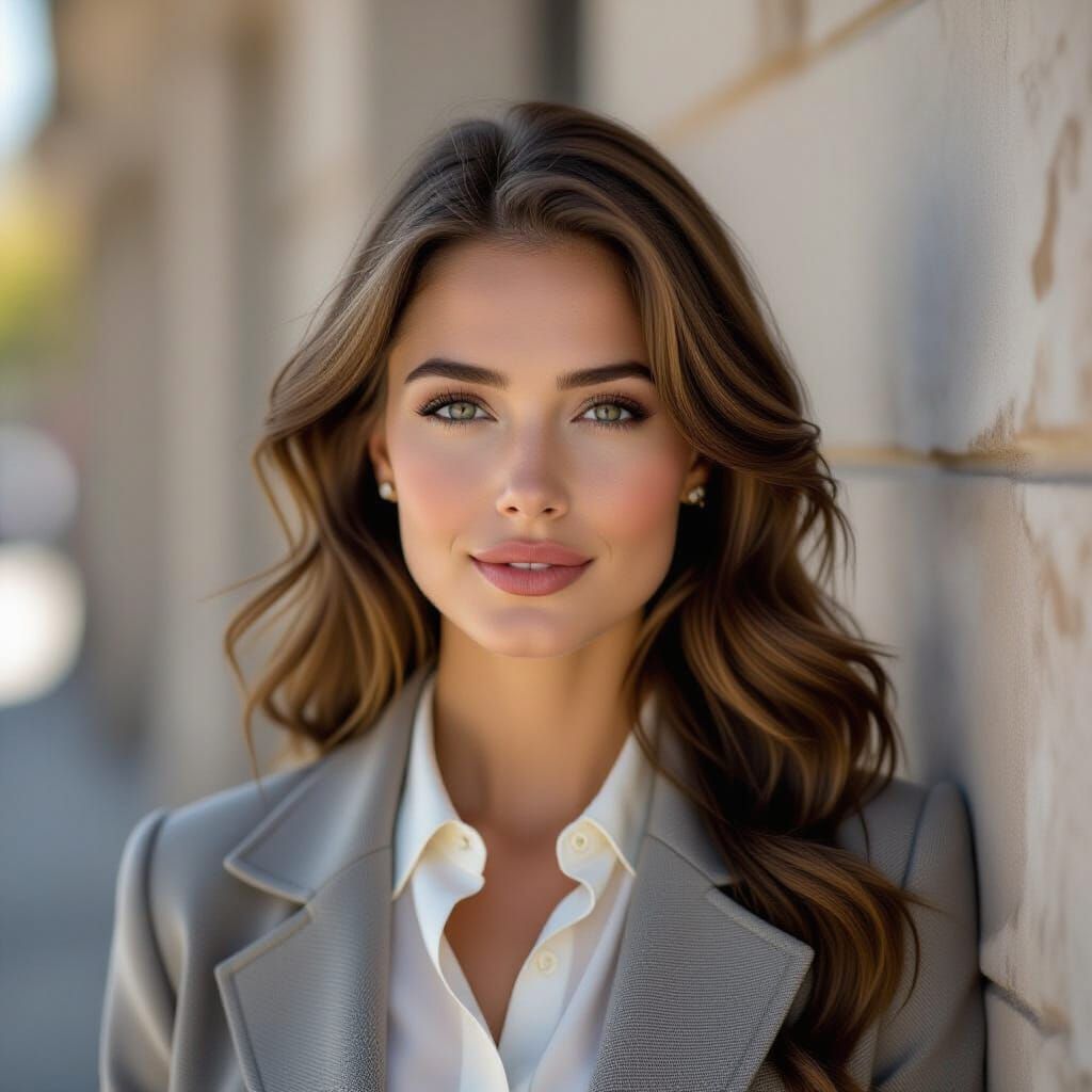 This photorealistic image shows Elizabeth Montgomery at age 24, dressed in a chic, contemporary ensemble. Captured with professional camera settings and soft, natural light for high resolution detail.