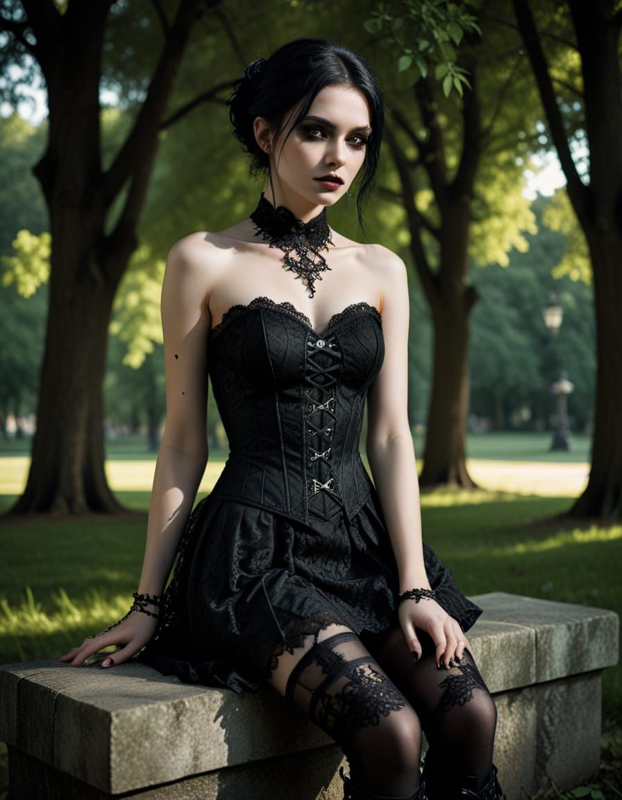 This image shows a woman in gothic attire posing in a park. The full-body shot features dramatic lighting and shadows, high contrast, and vivid details. The aesthetic is high-fashion gothic chic.