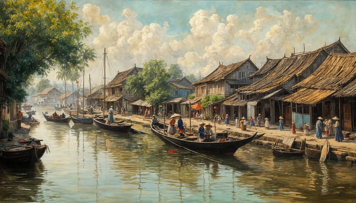 This image is an oil on canvas painting depicting a bustling 1900s Hoi An river harbour scene with historical Vietnamese houses and Chinese junks, in the style of Sali Herman.