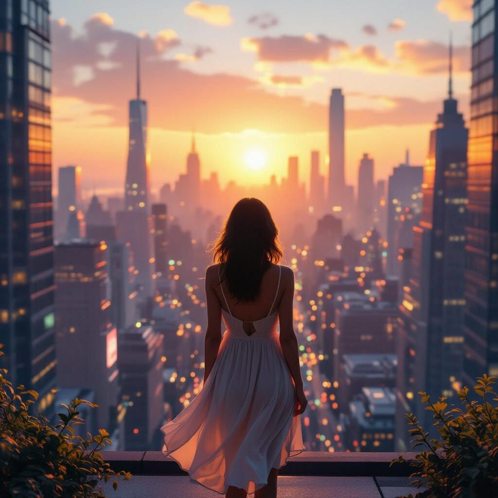 A young woman in a summer dress observes a breathtaking cityscape bathed in golden light. Skyscrapers glow, streets reflect the sky, and a soft haze creates a dreamlike atmosphere in a pastel-orange and pink palette.