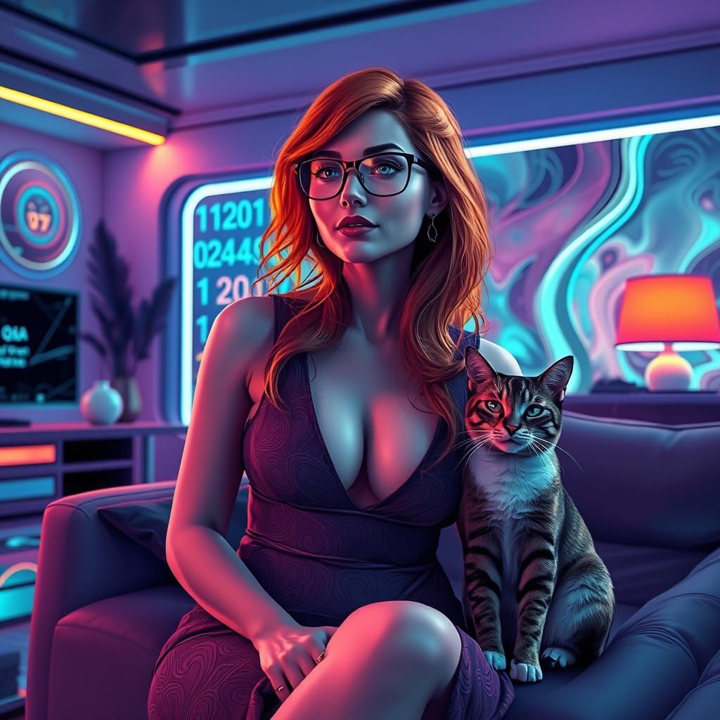 A ginger woman in a low-cut dress and glasses sits with her cat in a futuristic home, featuring screen text. The art style is abstract vector fractal with intricate shading and vibrant colors.