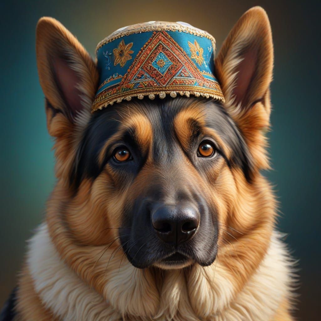 A detailed portrait of a German Shepherd wearing a kippah. The digital painting features vibrant colors, soft fur textures and intricate embroidery, highlighting themes of faith and animal friendship.
