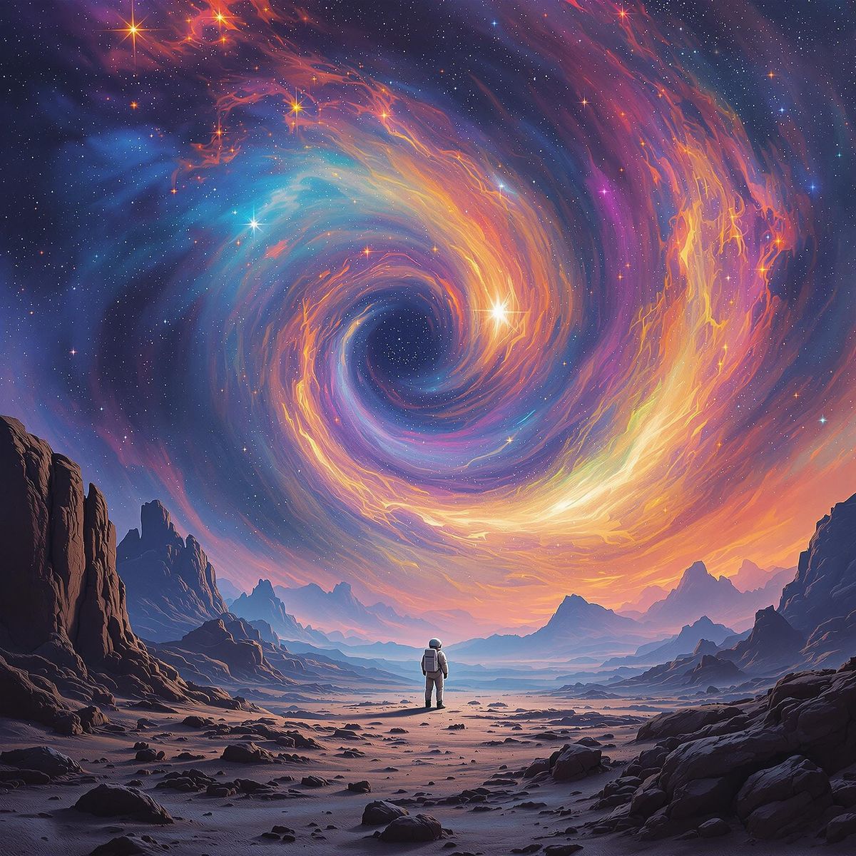 A surreal image of an astronaut on a desolate planet observing a colorful nebula. This artwork evokes a sense of wonder through swirling colors and otherworldly light, in a surrealist style.