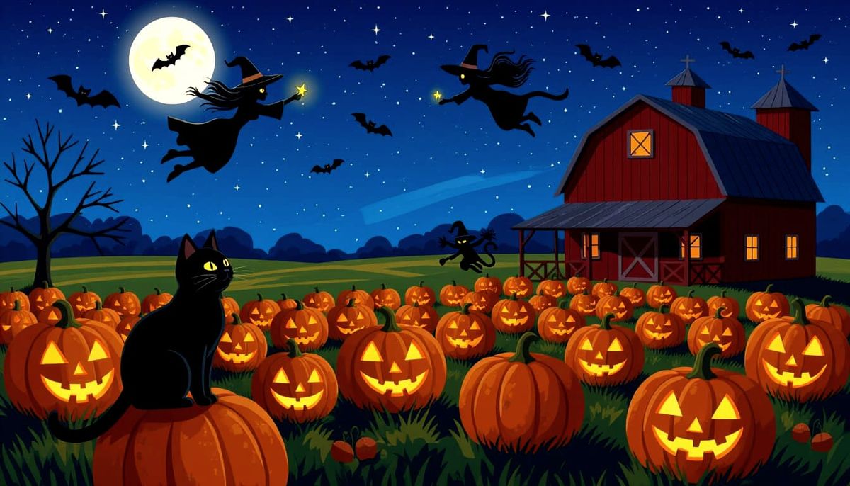 This image depicts a lively Halloween celebration at a nighttime farm, with a magical pumpkin patch coming alive. Features include flying witches and a black cat.