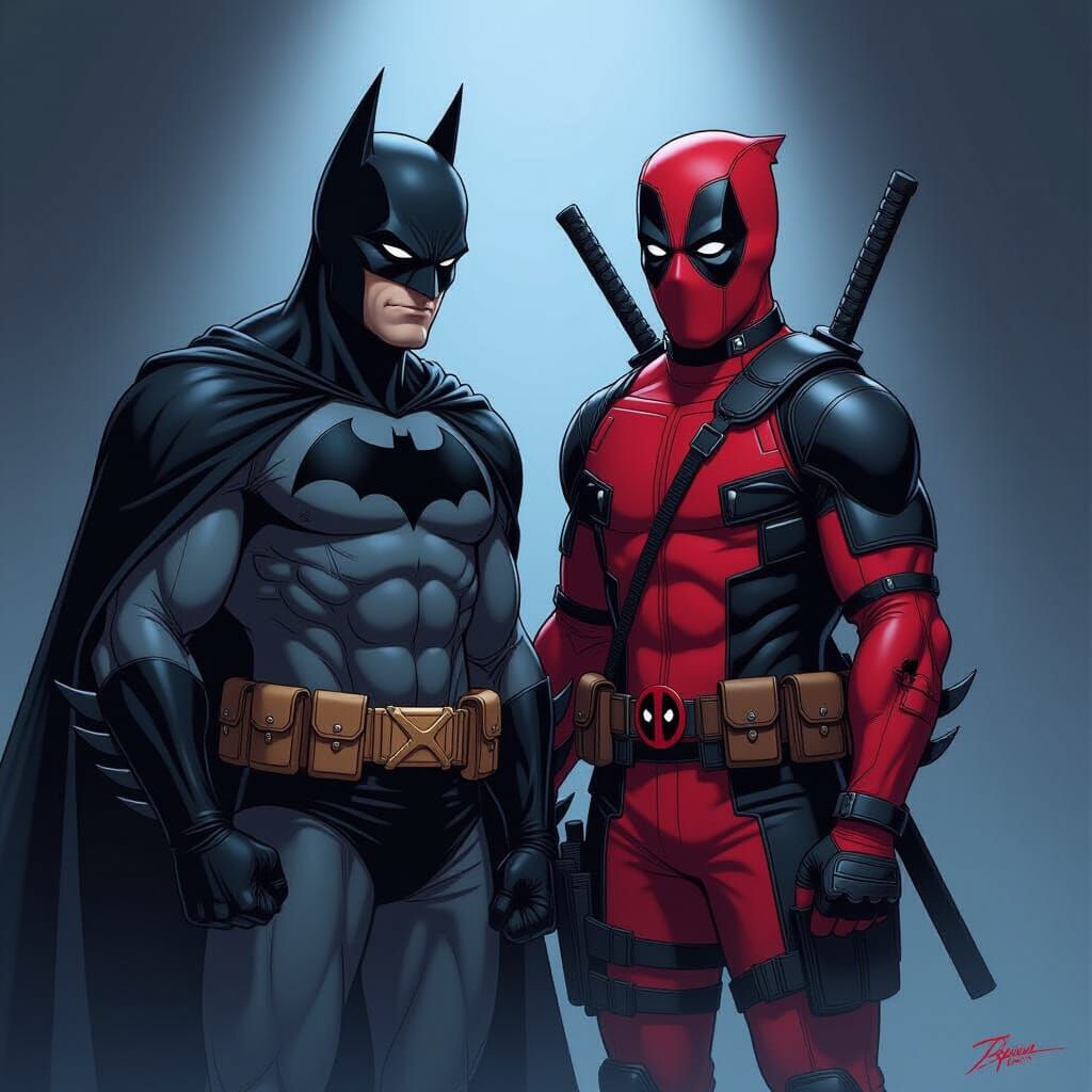 This image features Batman and Deadpool side-by-side, rendered in a detailed, gritty anime art style with dramatic lighting and deep shadows. Concept art with a cinematic feel.