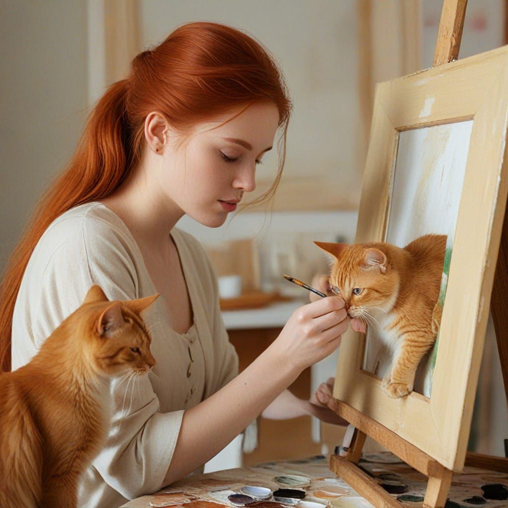 This image shows a red-haired woman painting a Siamese cat in an impressionist style. It features soft colors, warm lighting, delicate textures, and visible brushstrokes, creating a nostalgic, cozy, and serene atmosphere.