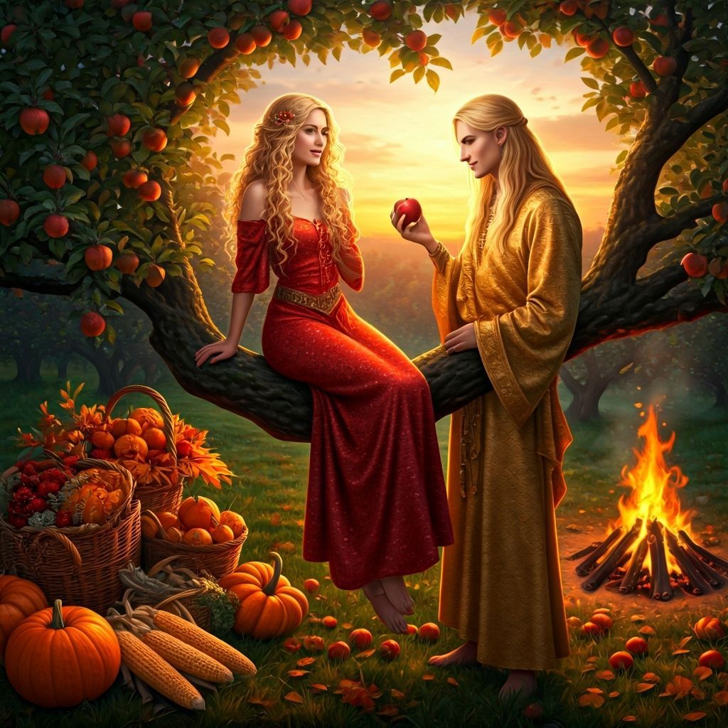 This image captures a romantic autumn harvest scene in a fantasy orchard. A couple in shimmering attire shares an apple on a tree branch, surrounded by bountiful pumpkins and a festive harvest table, rendered in a lush, warm, and detailed style.