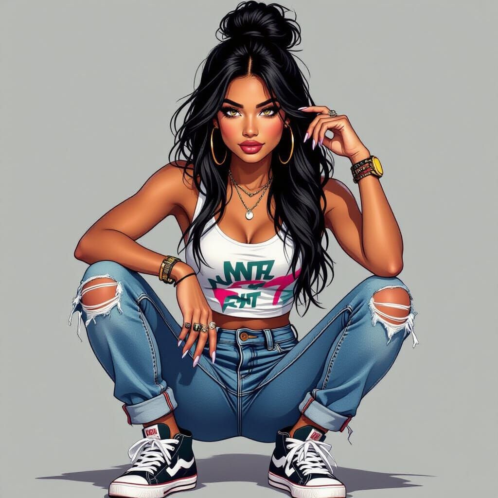 A striking picture of a confident 22-year-old Dominican woman in street dancer attire. The artwork features bold lines, vibrant colors, and hyper-realistic details in a noir style.