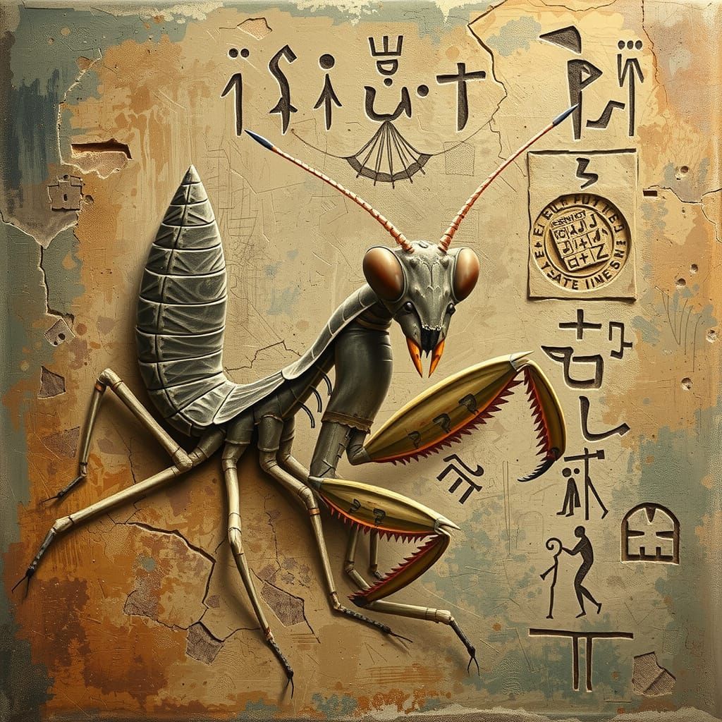 Two giant insects with metallic black exoskeletons, large compound eyes, and long, segmented antennae, are standing next to each other in front of an ancient stone tablet. The insects are positioned on the left side of the image, with their bodies turned slightly to the right, and they are examining ...