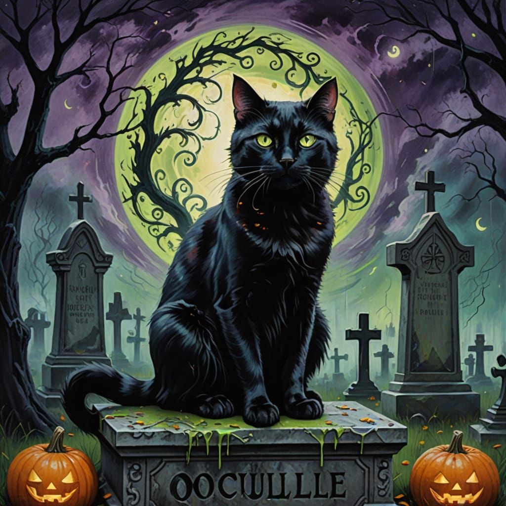 This oil painting captures a black cat with glowing green eyes on a gravestone during a mystical Halloween night. Dripping paint and ethereal light enhance the haunting, gothic atmosphere.