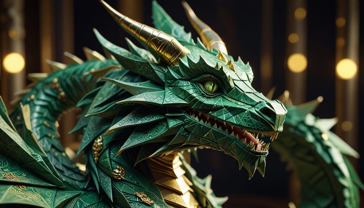 This image showcases a detailed green origami dragon crafted from hundred-dollar bills, featuring intricate folds and golden accents. It's presented in a dark fantasy concept art style with dramatic lighting.