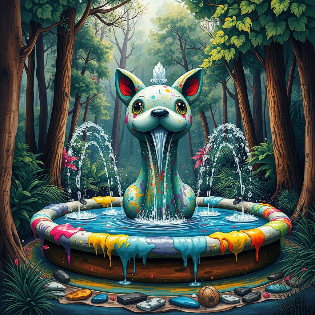 This image shows an animal-shaped fountain in a magical forest setting. The artwork evokes graffiti art with splash art elements, high contrast, and a colorful, ultra-detailed aesthetic.