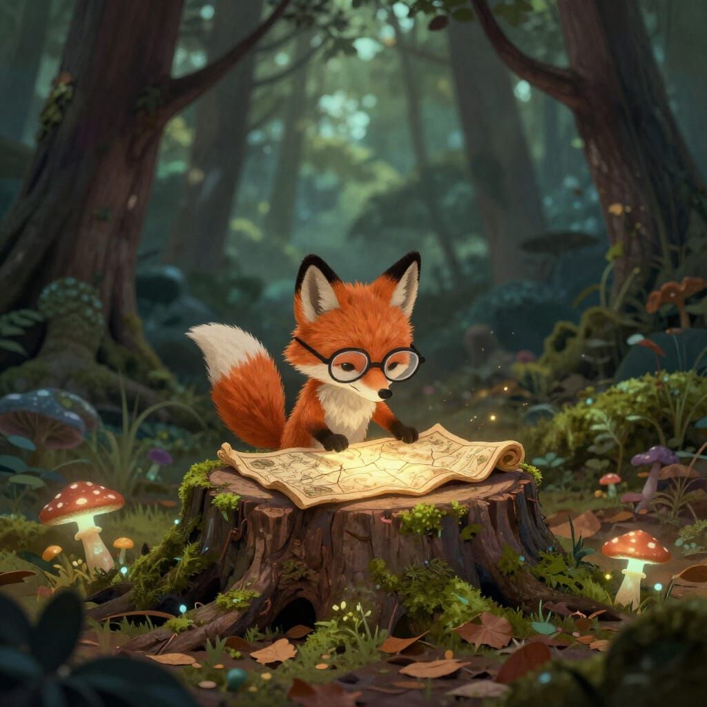 This image shows a tiny fox with glasses examining an old, luminous map on a tree stump. The scene features bioluminescent mushrooms and has a lo-fi, grainy indie game art style.