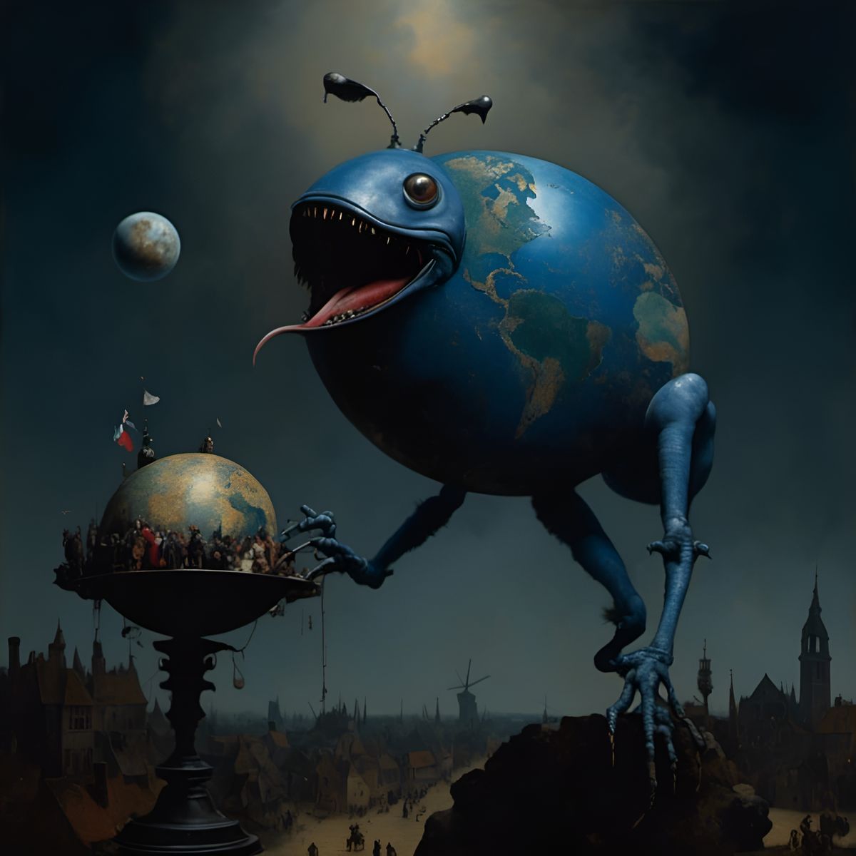 A striking picture of a blue alien desiring the Earth. The artwork employs an eerie, hyperdetailed style on canvas, resembling neo-expressionism.