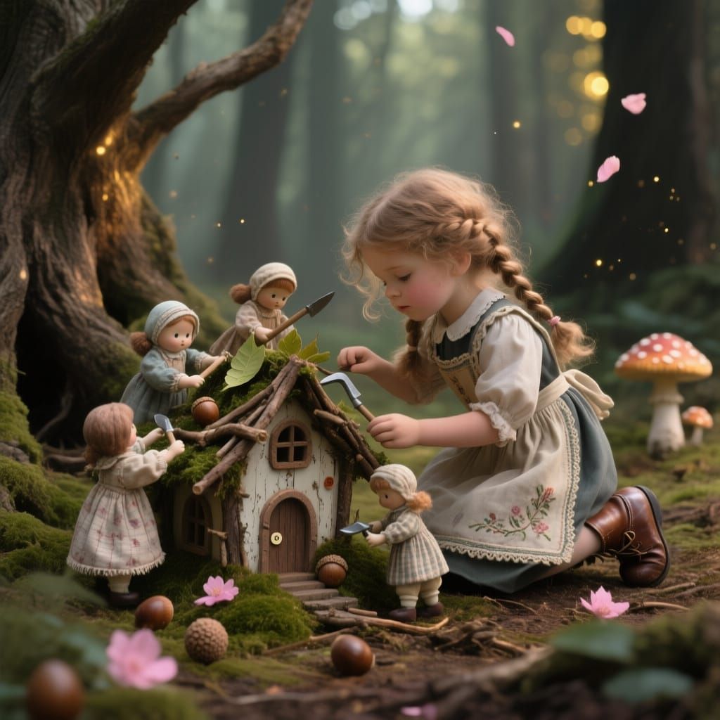 This image shows a girl helping porcelain dolls build a twig house in a forest clearing. The photorealistic scene uses muted forest tones with magical touches of light and dust.