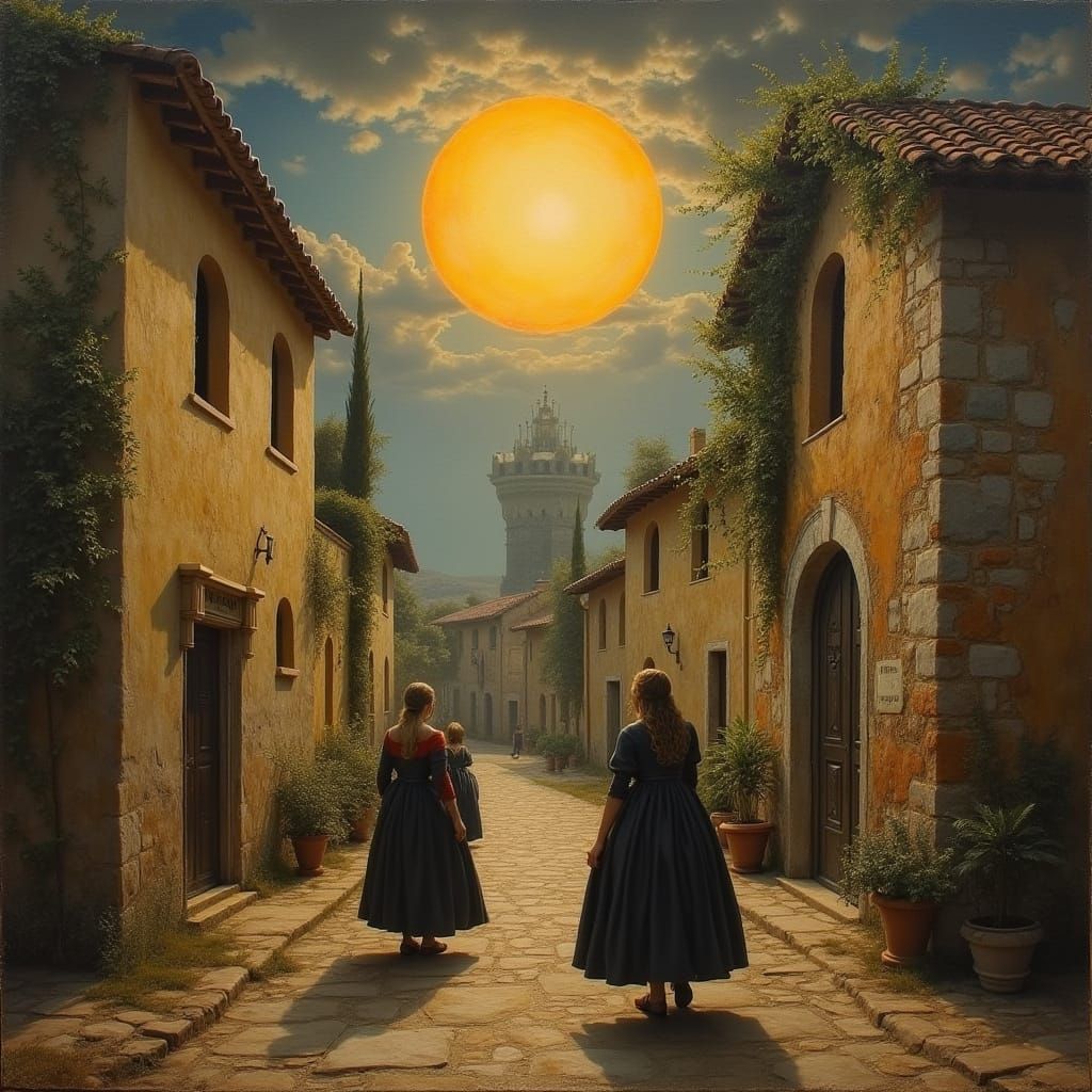 Uma cena de vilarejo medieval surreal inspirada no estilo de Raphael, com mulheres magras caminhando pelas ruas molhadas, acompanhadas de um objeto antigo com a inscriรงรฃo 'BG'. O vilarejo apocalรญptico as rodeia, com ruรญnas distantes e vestรญgios de uma civilizaรงรฃo esquecida. Acima delas, o cรฉu estรก coberto ...