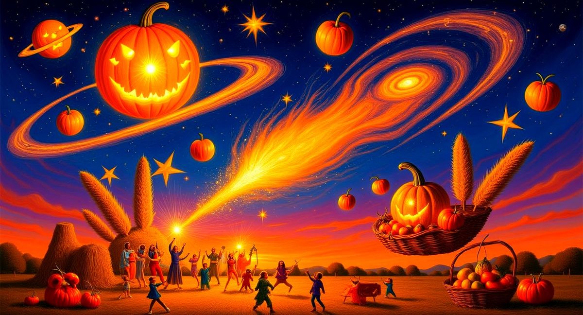 A surreal harvest dreamscape where the bounty of autumn floats through a cosmic sky. Giant glowing pumpkins orbit like planets, apples drift like stars, and golden wheat sheaves spiral into galactic shapes. A massive corn cob unfurls into a radiant comet, leaving a trail of shimmering husks. Below, a village festival takes place on a floating hay bale island, with tiny figures dancing among radiant gourds and glowing baskets of fruit. The entire scene feels whimsical, psychedelic, and otherworldly—an autumn harvest reimagined as a cosmic celebration. Ultra-detailed, visionary digital art, radiant glowing colors, dreamlike atmosphere.