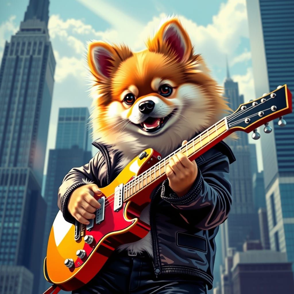 This image shows a Pomeranian dog in a leather jacket shredding on an electric guitar, with New York skyscrapers in the background. The artwork is in a vibrant, futuristic style.