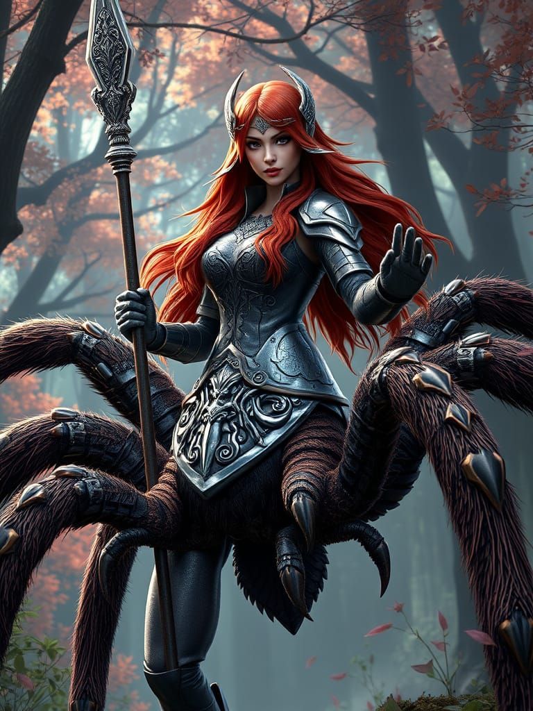 This image shows a stunning, detailed digital artwork of a female drider in fantasy metal armor, set against a colorful mystical forest background. Her beautiful face and wild red hair are framed by intricate, segmented metal plates that accentuate her spider legs, while her spear at the ready adds a sen...