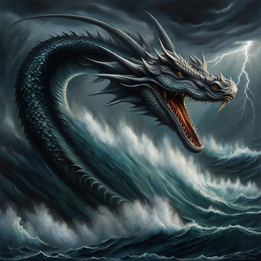 A striking picture of a Leviathan emerging from a stormy sea. The sea serpent is depicted with dark lighting and spiky features, set against a moody, cloudy backdrop.