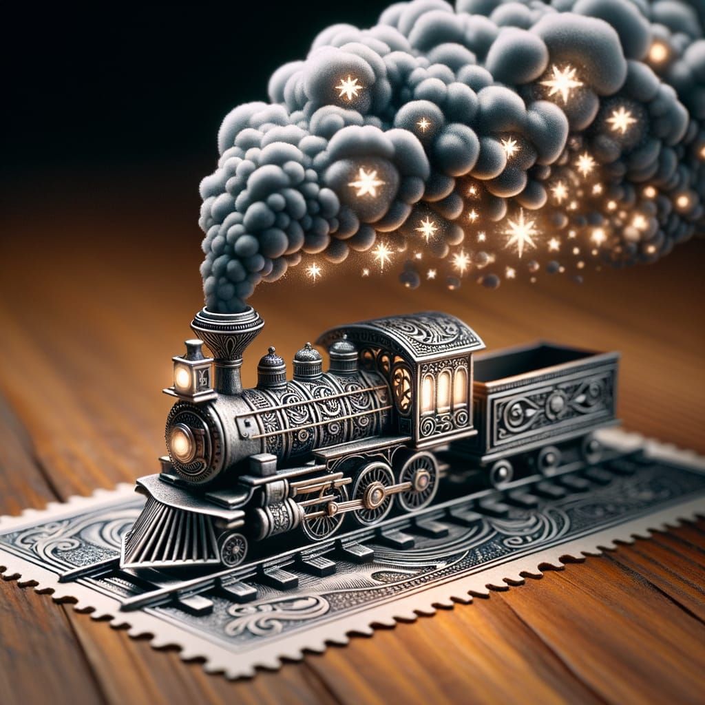 This image shows a tiny, ornate steam train emerging from a postage stamp on a wooden table. Smoke billows upwards, transforming into twinkling stars, creating a magical miniature night sky.