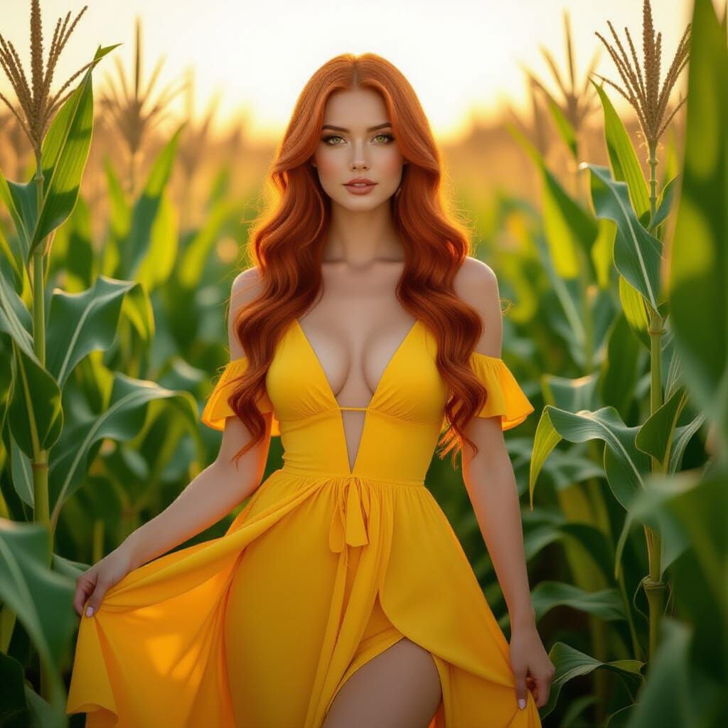 A striking picture of a young woman with vibrant red hair posing in a yellow summer dress amid a cornfield. The image evokes art nouveau and realistic painting styles.