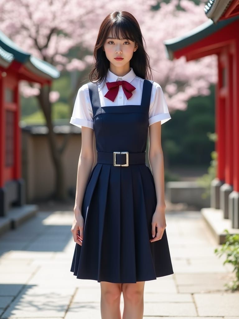 A full body portrait of an 18-year-old Japanese woman in a school uniform, resembling Audrey Hepburn, standing in a sunlit shrine courtyard.