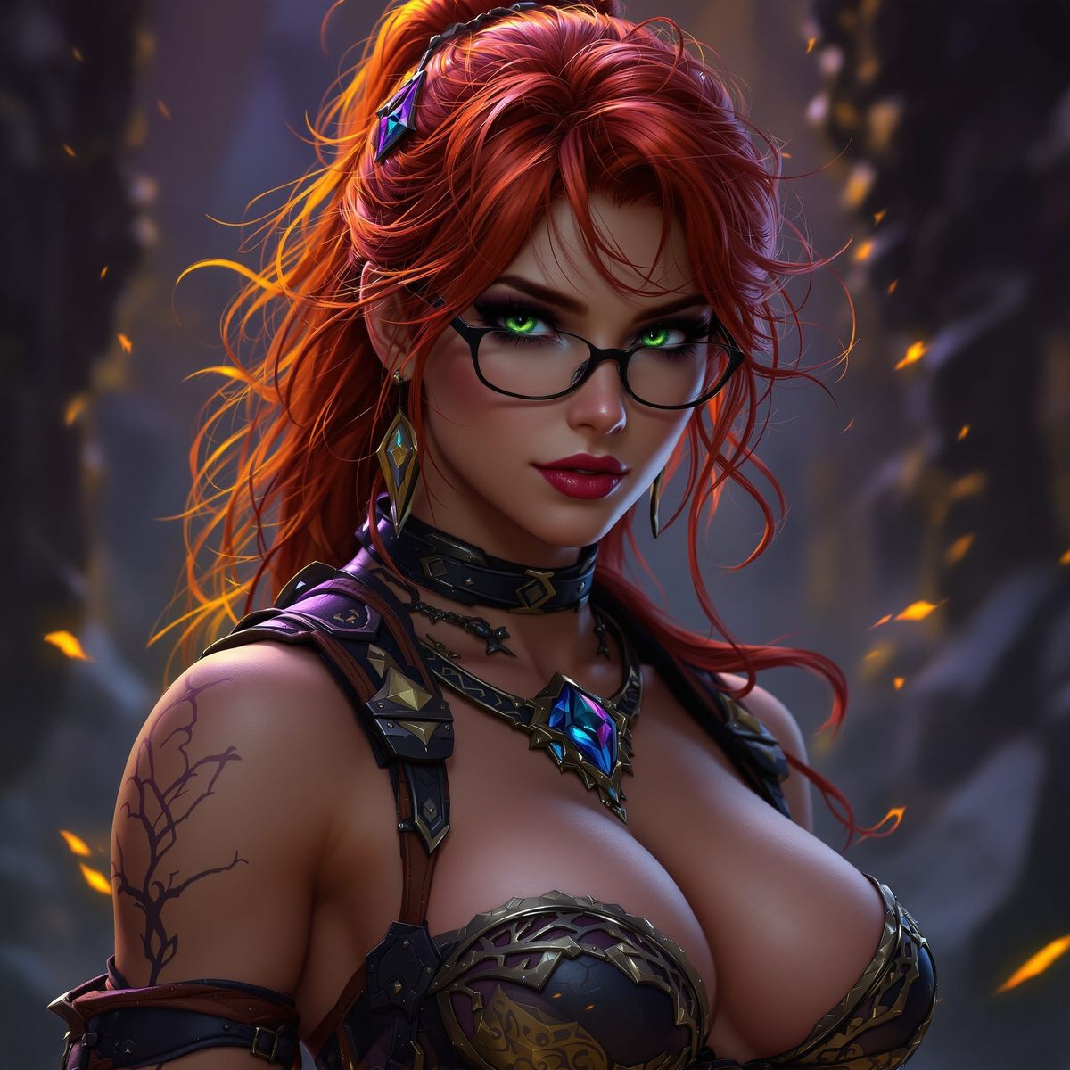 A striking picture of a muscular, red-haired woman with green eyes wearing glasses and an elaborate harness. The image features dynamic lighting, detailed textures, and rich complementary colors in a dark fantasy aesthetic.