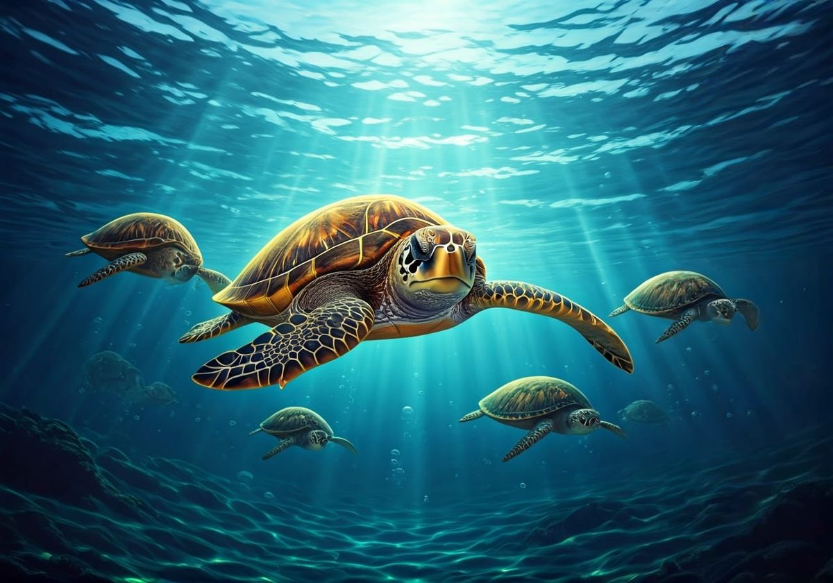 This image shows a group of sea turtles swimming underwater. Sunlight creates beams through the water, illuminating the beautiful scene in a fantasy realism aesthetic with gold colors.