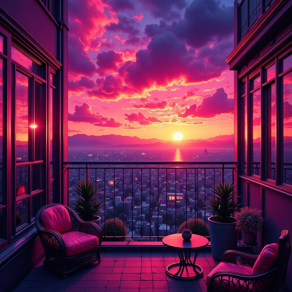 This image captures a glamorous sunset view from an exclusive high-rise balcony, featuring vibrant pink, orange, and violet skies. It's rendered with bold lines, high contrast, and dramatic lighting, evoking classic 1940s graphic novels and urban glamour.
