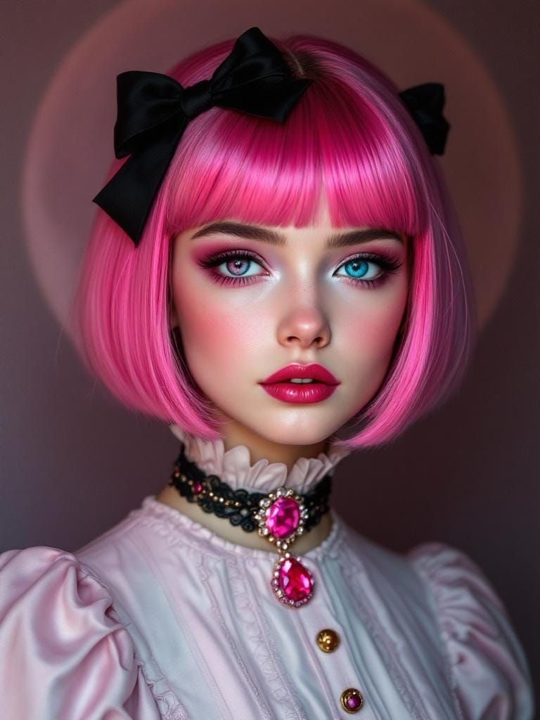 A captivating portrait of a young woman with heterochromatic eyes and pink hair, reminiscent of aged fresco paintings. She wears a Victorian-style outfit complemented by a jeweled choker, set against a soft backdrop.