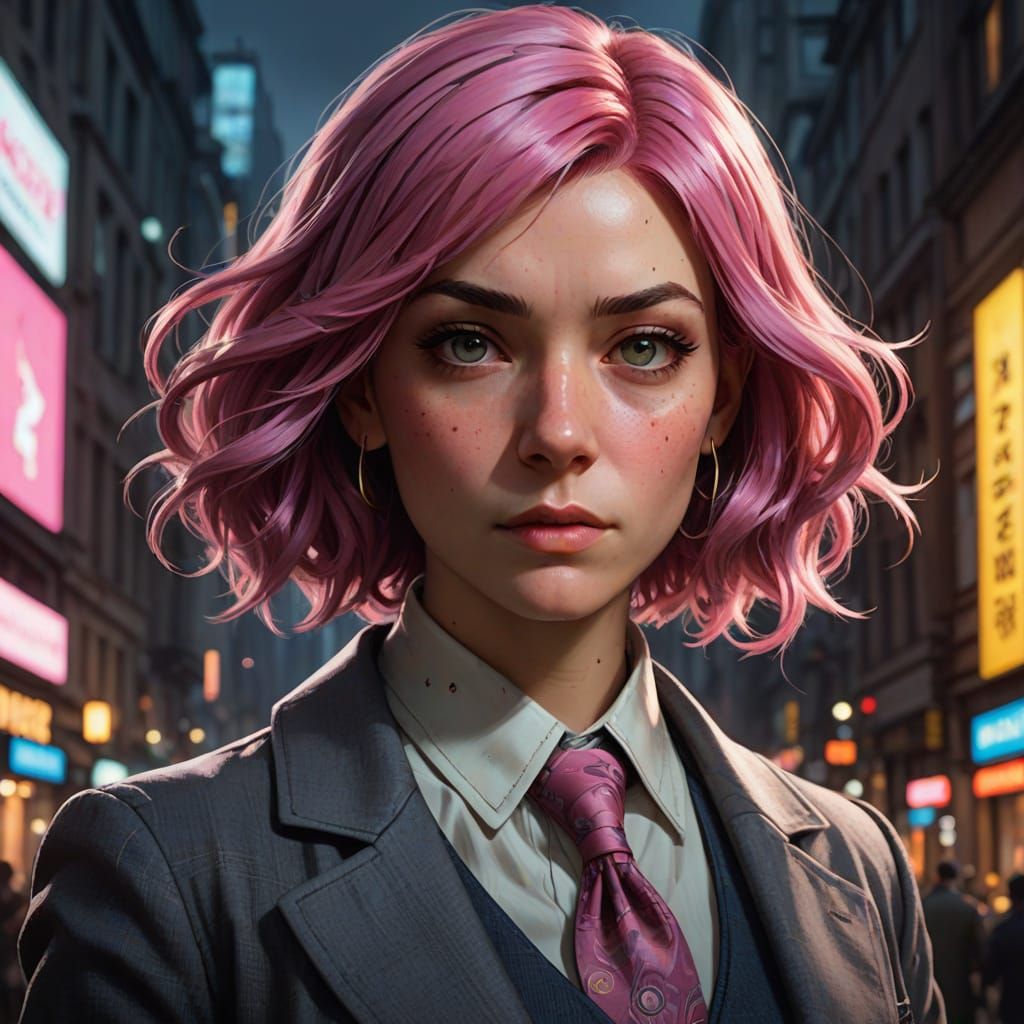 This image shows a highly intelligent, pink-haired detective in a detailed portrait. The artwork features dynamic lighting and vibrant triadic colors, rendered in a concept art style.