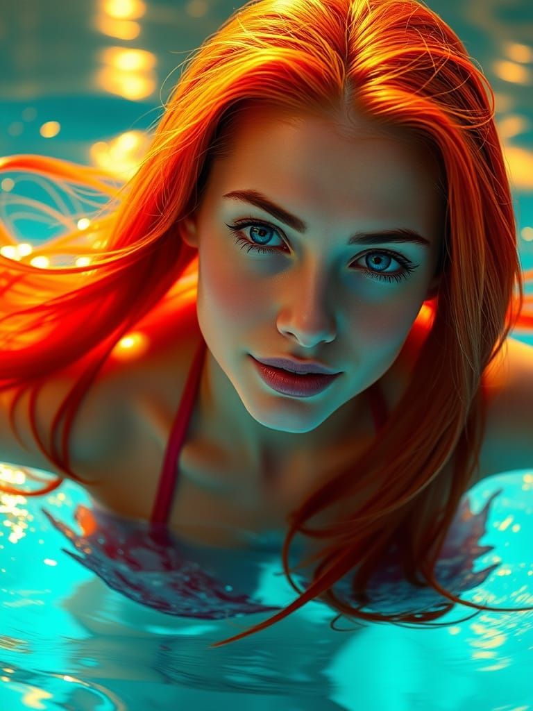 This image shows a beautiful woman with long red hair swimming in a pool. The digital art features shimmering lights, lifelike colors, and warm golden hour lighting.