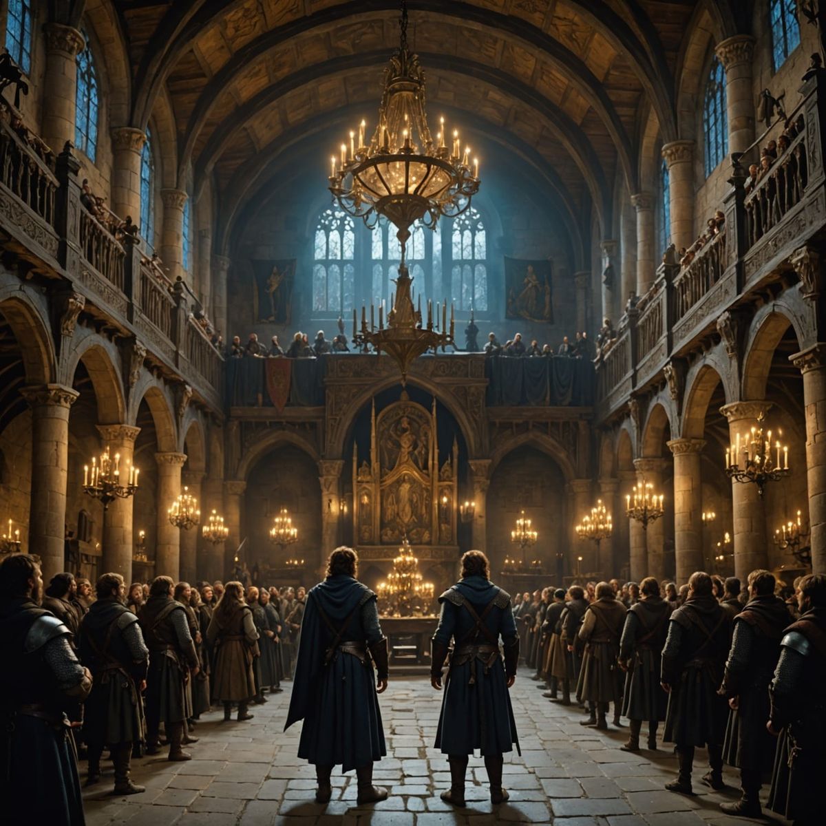 A majestic medieval scene unfolds under golden chandeliers, where warriors and nobles revel in their triumph. A young hero stands frozen, amidst eerie runes and foreboding prophecy, as dark clouds gather and a ghostly figure looms. Rich, dramatic lighting captures the contrast between festivity and impen...