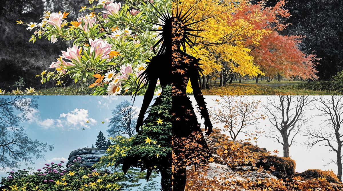 A vibrant fantasy collage of a powerful figure blending seasonal landscapes, including spring flowers, summer forests, autumn leaves, and winter snow, in a captivating cyberpunk aesthetic.
