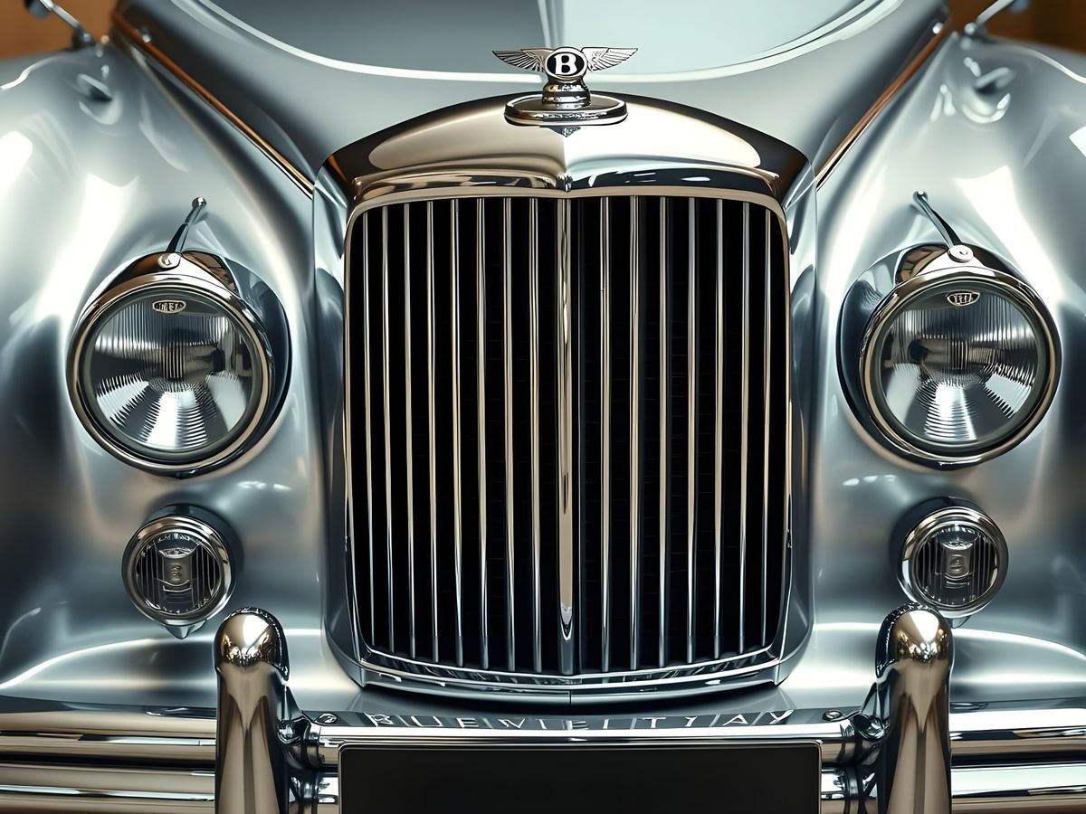This image showcases a stunning, vintage Bentley with a silver coat and gleaming chrome radiator, captured in exquisite close-up detail, blending photorealism with industrial design elements.